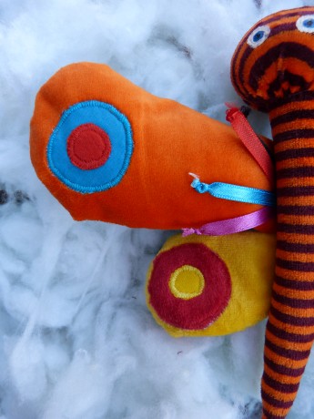 hračka pre deti.Vyrobená z bambusového aksamitu certifikovaná pre deti do 3 rokov a 100% bavlny. Výborná na zavesenie na kočík, do postieľky alebo kamkoľvek inam. Vnútro je z dutého vlákna. V spodných krédielkach sú rolničky. Výrazné farby priťahujú ich